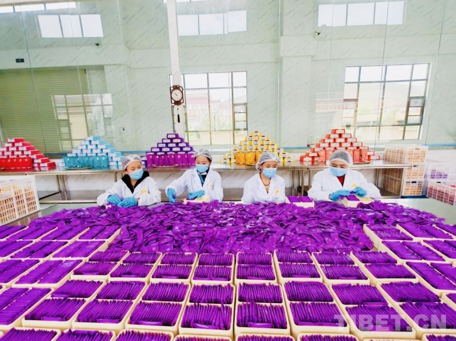 图为工作人员正在打包青稞饼干