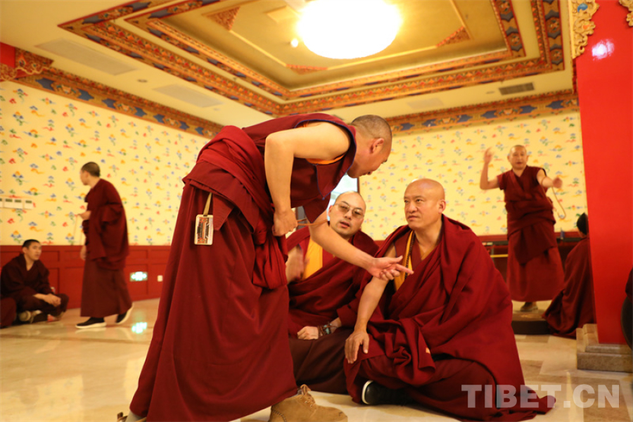 图为西藏佛学院学员与中国藏语系高级佛学院学员辩经交流 摄影:王茜