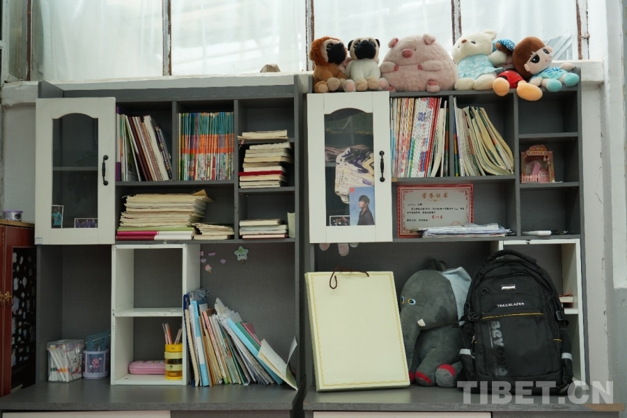 图为罗启明、尼吉女儿的书桌,右下角为中央代表团阿里分团赠送的书包 摄影:冯重霖