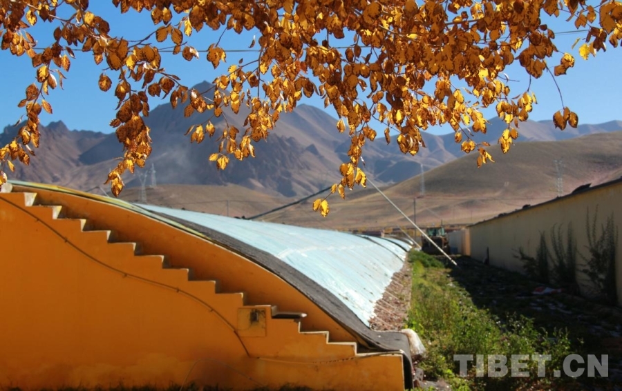 图为阿里狮泉河镇噶尔县生态农业产业园内,大棚上的秋叶 摄影:赵钊