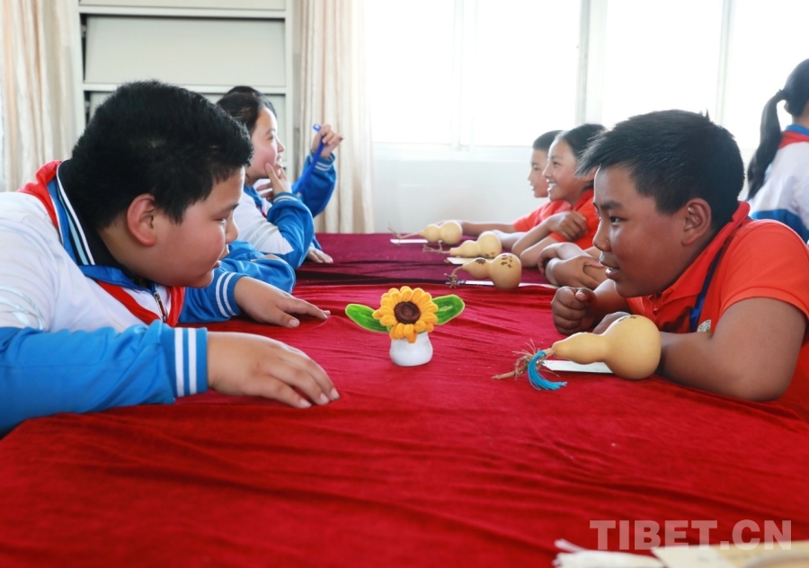 图为山东聊城堂邑镇中心小学的孩子们向西藏阿里噶尔县孔繁森小学的小伙伴赠送当地特色的葫芦和祝福卡片。每一张卡片上都有孩子们亲手写下的最想对远方的小伙伴说的祝福语、心里话。摄影:刘莉
