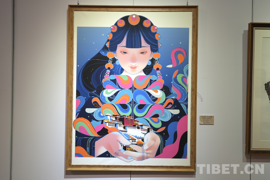 展览现场,参展艺术家李旻的作品《虹光圣城》色彩绚丽,构思新颖,引得众多观众驻足观看。据介绍,本幅作品是一副综合运用了现代艺术创作手段的数字绘画,同时融入了如布达拉宫、藏装等经典的藏式元素,画面生动,色彩鲜艳,形式新颖,展现了当代西藏艺术的传承与创新,是本次展览极具代表性的作品之一。