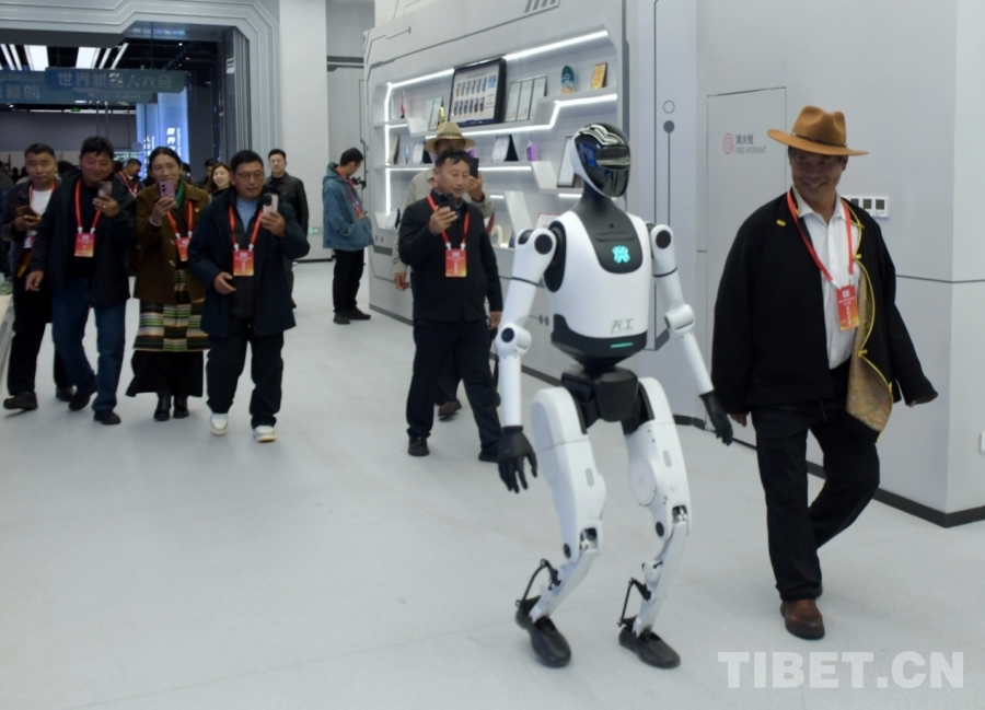 图为西藏林芝波密县基层干部在与智能机器人互动 摄影:唐召明