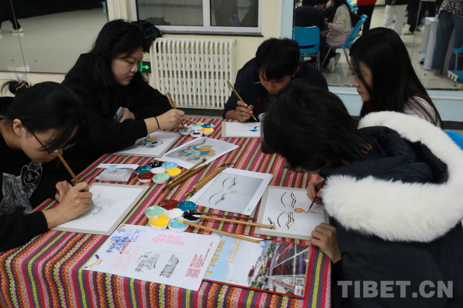 图为同学们在活动现场体验传统唐卡绘画。摄影:毕然