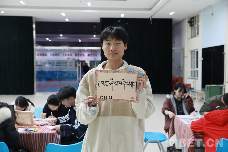图为2024级公共管理专业的杨乘鹤同学展示他在藏文书法体验环节创作的作品。摄影:毕然
