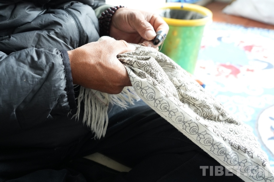 图为合作社员工在做精美刺绣,编织这条刺绣围巾需耗费一个月之久 摄影:张艺彤