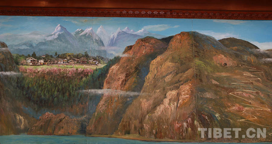 图为色龙村内建筑上的壁画,生动描绘了色龙村所处的特殊地理条件,右边的盘山公路蜿蜒通过隧道之后而有左边的“桃花源” 摄影:王妍丹