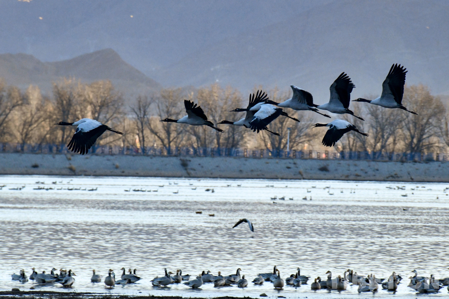 黑颈鹤是世界上最晚被发现的一种鹤类,是全球15种鹤类中唯一一种繁殖和越冬都在高原地区的鹤类,也是中国特有的珍稀鹤类,属国家一级保护野生动物,在《中国生物多样性红色名录—脊椎动物卷》(2020)中被列为易危(VU)物种。它们主要栖息于海拔2500米至5000米之间的高原湿地,曾因环境恶劣、食物匮乏导致种群数量岌岌可危,因此被誉为“鸟类大熊猫”,它们飞越崇山峻岭,甚至飞过世界之巅——珠穆朗玛峰,飞行高度可达万米。据学者观察,黑颈鹤主要分布于中国甘肃、新疆、西藏、青海、云南、四川西部、贵州和内蒙古。每年冬季,大批黑颈鹤从繁殖地迁徙到雅鲁藏布江中游河谷地带越冬,而拉萨市林周县是黑颈鹤在此重要的越冬地之一,黑颈鹤数量可达到2000余只。
