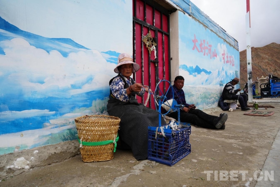 图为岗巴县吉汝村村民在街巷中纺织毛线