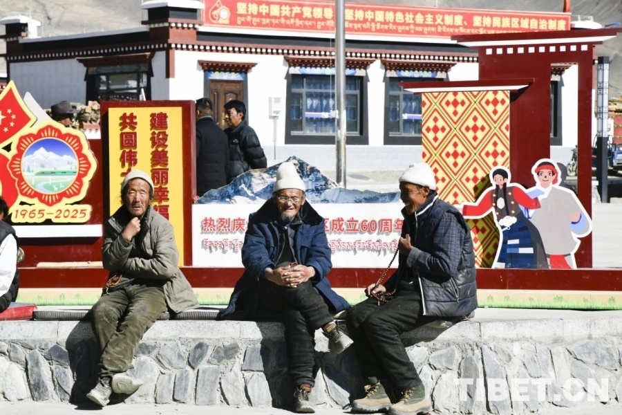 图为定日县长所乡森嘎村老人在村中广场沐浴阳光,快乐交谈。摄影:赵振宇
