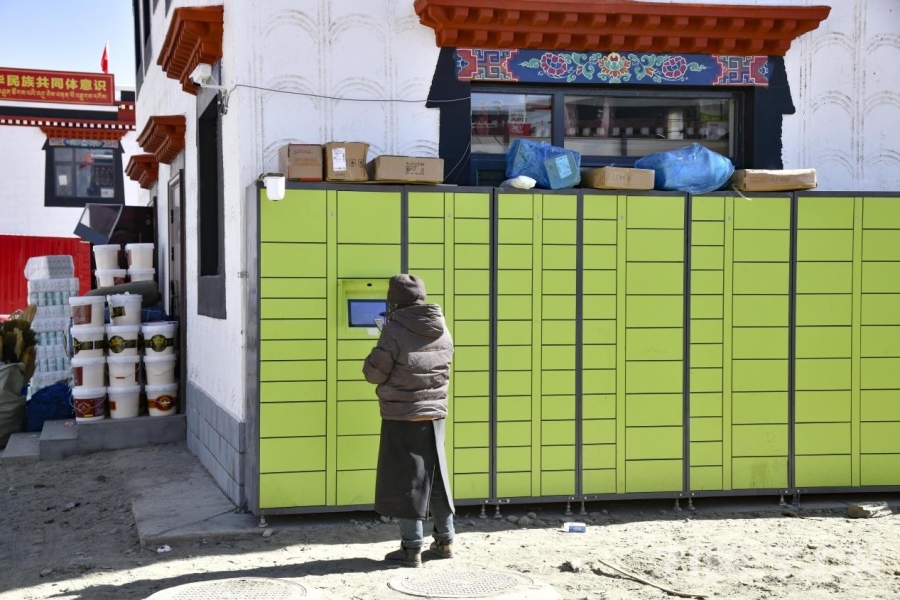 图为定日县长所乡森嘎村村民在自动快递柜前收取快递。摄影:赵振宇