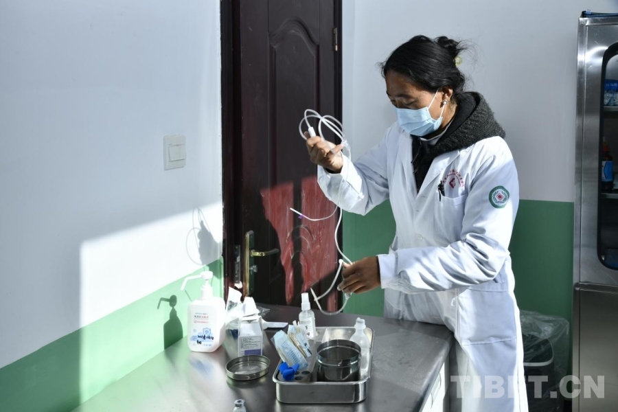 图为在定日县长所乡森嘎村新修建的村卫生室内,护士正在做医疗准备。摄影:赵振宇