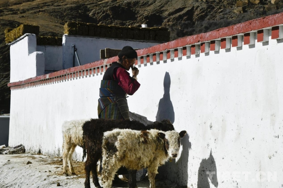图为在定日县长所乡古荣村,村民正在为小牛梳理毛发。摄影:赵振宇