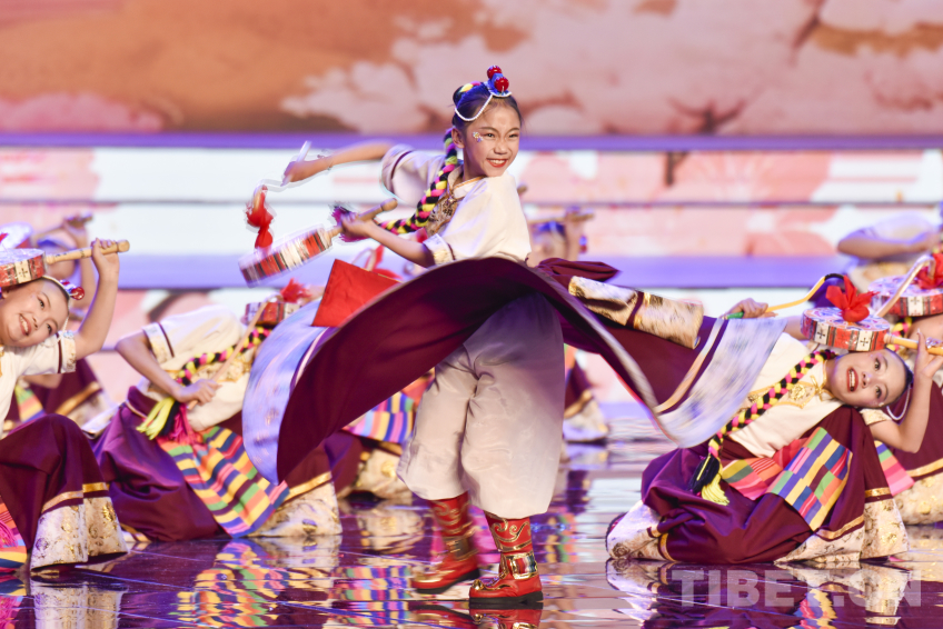 图为2026拉萨藏晚节目少儿舞蹈《鼓舞新时代》丹增珍美(中)与小伙伴一起为大家带来精彩热巴舞 摄影:赵振宇