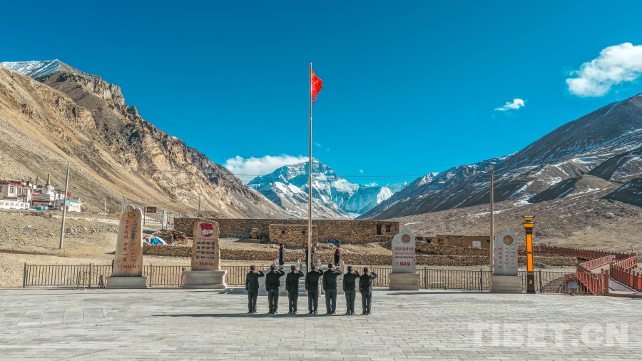 海拔5200米的珠峰大本营广场上,西藏边检总站日喀则边境管理支队珠峰边境派出所全体民警整齐列队。高原的风掠过雪山,扬起深色制服的衣角。
