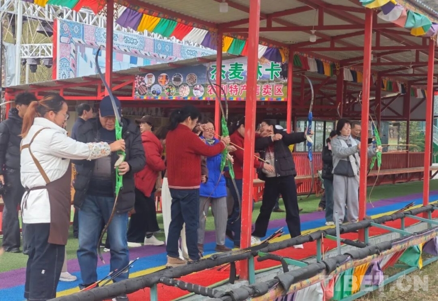 旅行团参与射箭等林卡特色互动项目