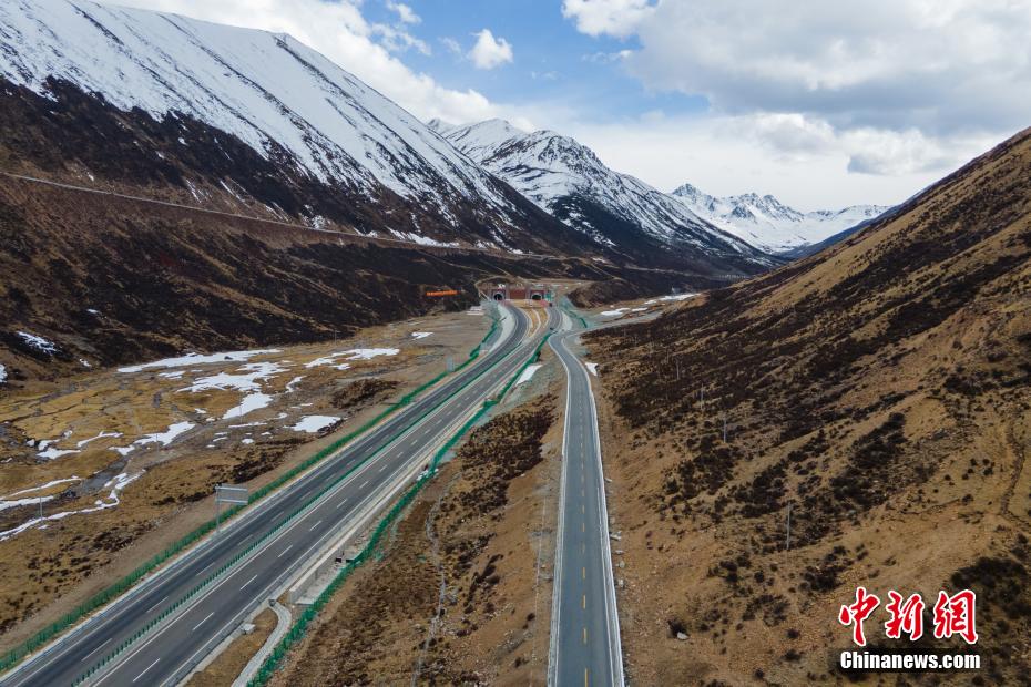 图为航拍西藏拉林高等级公路,春日时节高海拔路段沿线仍有积雪。 江飞波 摄