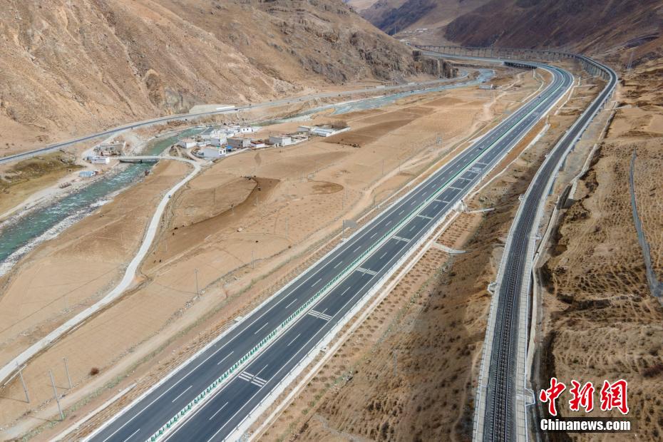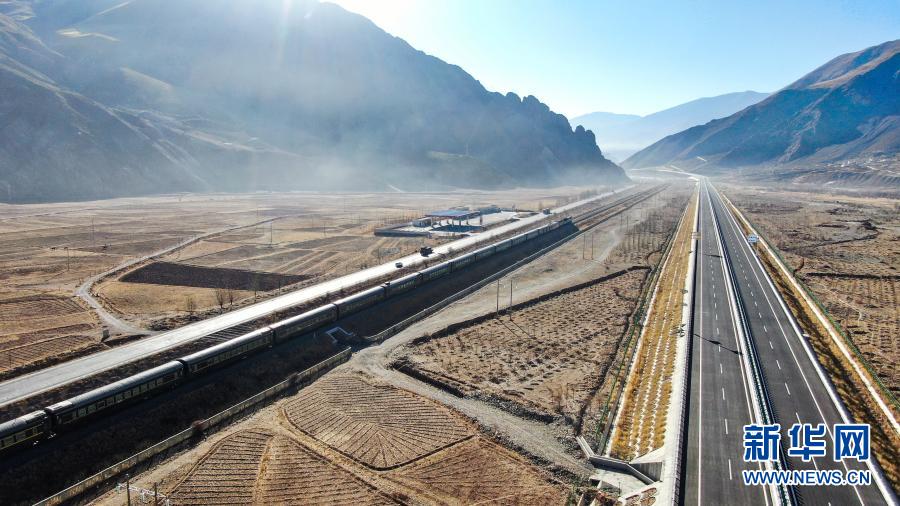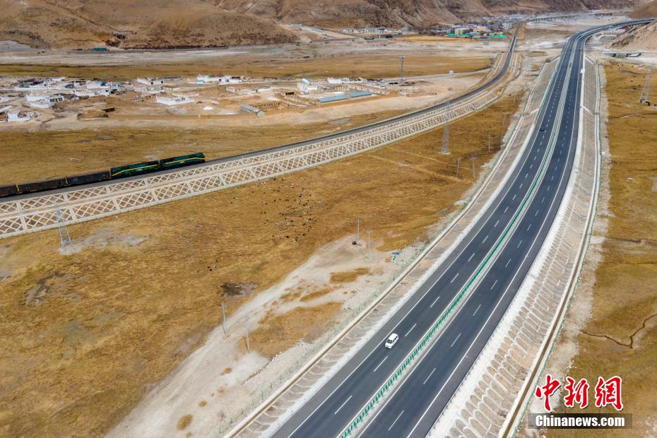图为航拍拉萨至羊八井高等级公路,此时青藏铁路正好一列火车经过。 江飞波 摄
