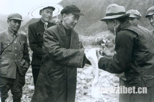 资料图:1954年8月,张经武护送十四世达赖走过康藏地区,沿途接受各部落头人的拜访,向他们宣传党的政策。左起:彭哲、李佐民、张经武、昌都地区的千户霍尔加色·思朗江村。