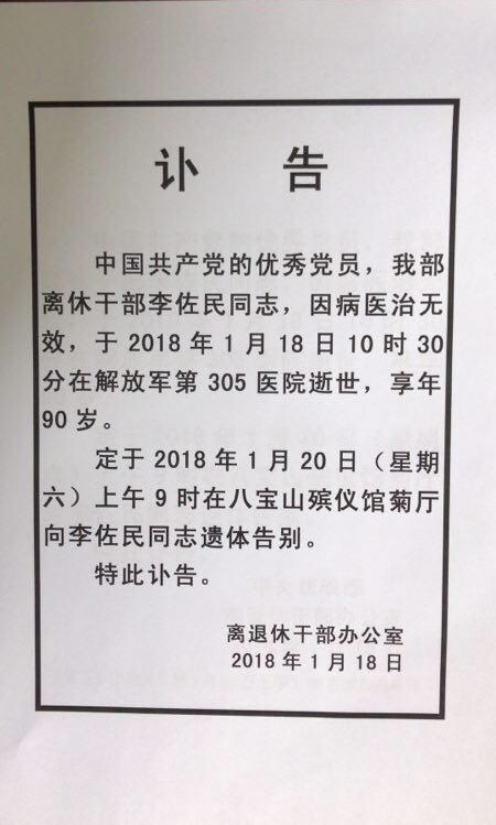 中国西藏网讯 李佐民先生因病医治无效,于2018年1月18日10时30分逝世,享年90岁。