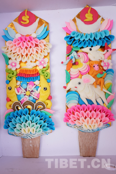颜值最高的当属“孜扎”(供奉在切玛盒内的酥油花)了,在拉萨年货市场上非常热销。艺人们先是在酥油中加入各色矿物颜料,制成胚料,再用手工捏制成佛像、人物、花卉树木、飞禽走兽等。图案不一样、寓意也不一样。酥油花最常见的“和气四瑞图”寓意和谐美满,“吉祥八宝图”寓意平安多福,“长寿图”寓意万寿无疆。