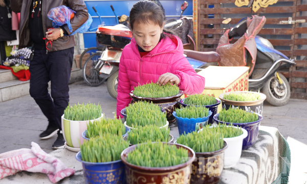 最有生命力的是那一盆盆嫩绿的青稞苗。藏历新年的几天前,拉萨街上到处都能见到青稞苗,冒出尖尖小角的绿苗栽种在小小的花盆之中,预示着来年的丰收吉祥,让人感觉到“春天离我们不远了”。