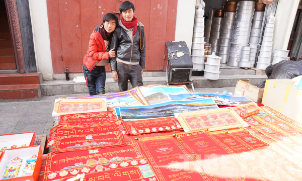 最红火的是鲜红的藏式春联,精致的红纸上面,金色的藏语熠熠发光。各式春联当中,当属“扎西德勒”出现最为频繁。由于双节为同一天,市场上藏汉双语春联同时登场,过年的气氛也更加浓厚了。(中国西藏网图、文/王淑 赵耀)