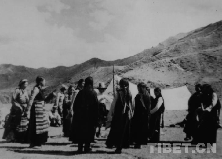 图为西藏文工团老照片:进军路上,向藏族同胞学习民间舞蹈