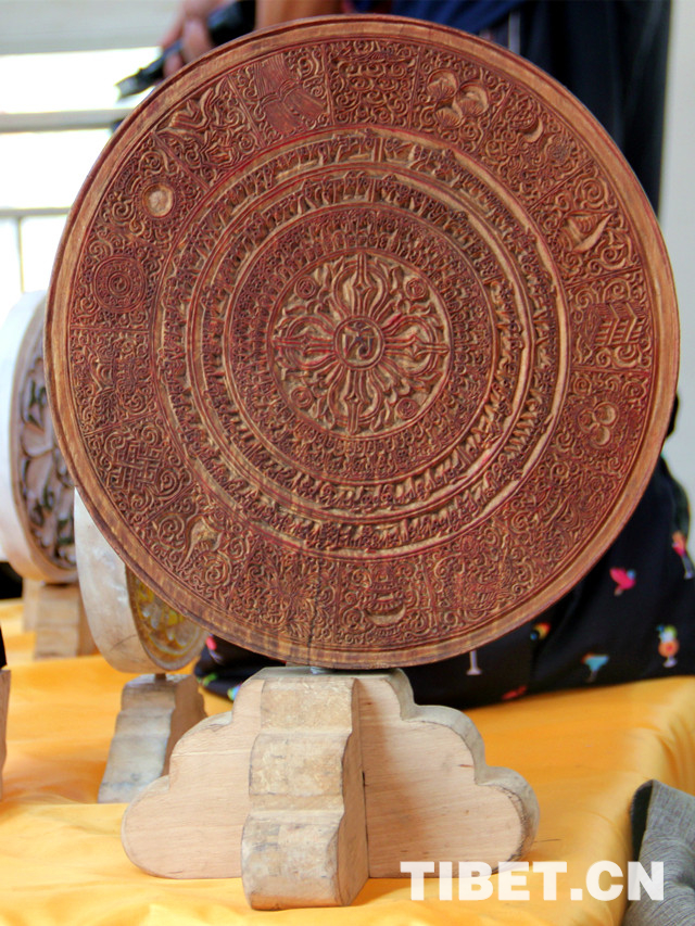 朗加拿出了他自己最满意的一件作品,这是他在传统刻板图案基础上设计创制的成名作,用时1个月刻制完成。作品的中心是藏文“ༀ”,四个角上是十字金刚,象征地球永恒坚固、万古长青,外圈是藏文字母和元音符号,再外圈是文殊菩萨心咒,最外圈是吉祥八宝图案,整个刻板图案寄托了朗加对地球家园的美好祝愿。