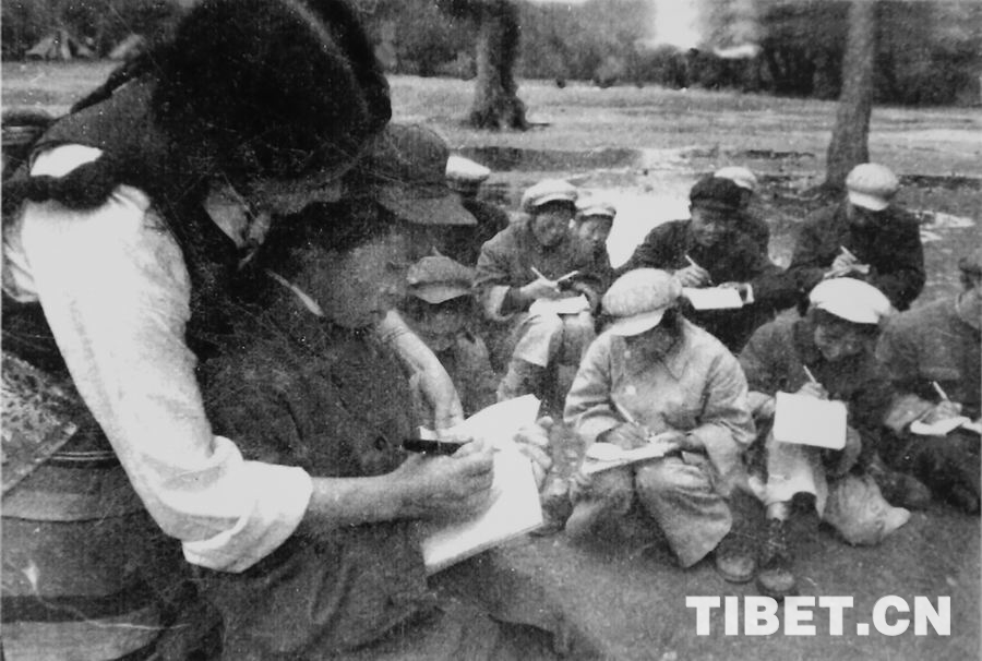 图为西藏军区文工团老照片:藏族老师教战士们学藏文