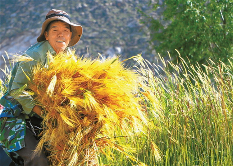 在拉萨市堆龙德庆区古荣乡加入村的青稞地里,金色的穗头深深地弯下了腰,微风吹拂下,黄灿灿的麦浪翻滚,一片喜人的丰收景象。图为农民露出喜悦的笑容。图片来源:拉萨晚报