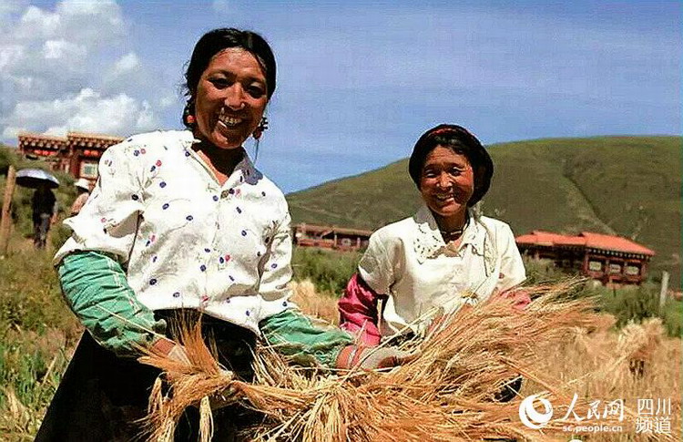 金秋时节,金灿灿的稻穗随风摇曳,西藏及四省藏区的当地农民忙着收割、晒秋,一派丰收景象。图为四川省甘孜藏族自治州农民喜获丰收。(四川甘孜外宣供图)