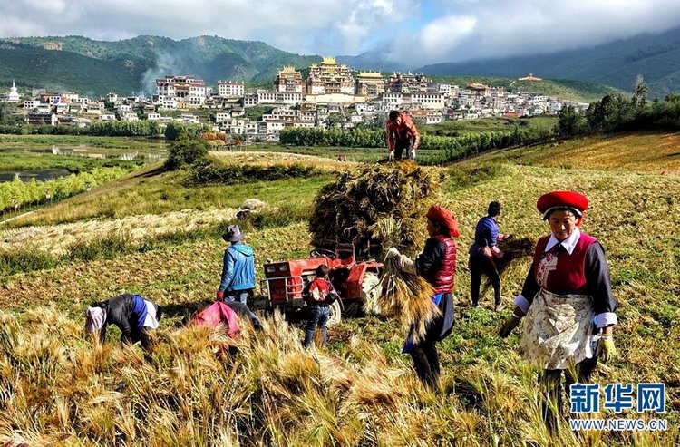 云南省迪庆藏族自治州香格里拉市的青稞进入收割期,片片青稞田金黄耀眼,处处都是丰收的繁忙景象。图为香格里拉市建塘镇农户趁着好天气收割青稞。新华网 崔永江 摄 (中国西藏网 综合/于超)