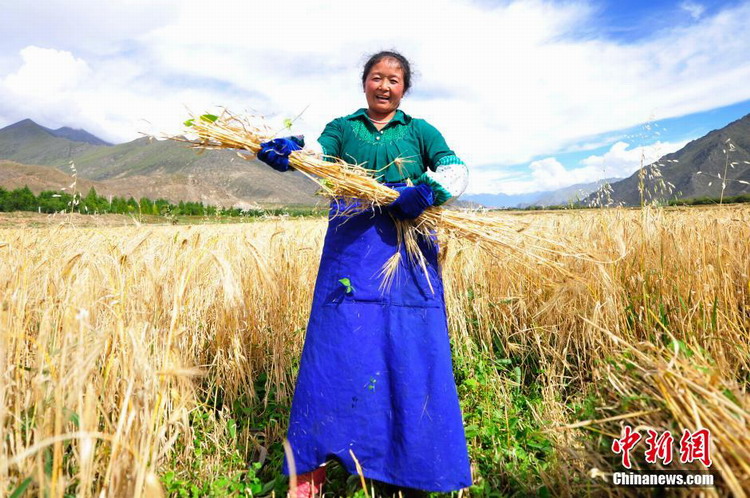 9月,西藏各农区已整体进入青稞等农作物的收获季节。在拉萨、日喀则等地,金黄色的麦穗铺满大地,处处都能看到农民、收割机在大片的青稞田里忙碌的身影,成为了高原一道独特的风景线。图为农民享受收获的喜悦。中新社 唐朝杨 摄