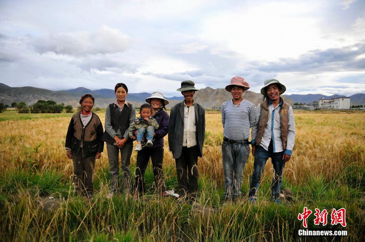 9月,西藏各农区已整体进入青稞等农作物的收获季节,在拉萨、日喀则等地,金黄色的麦穗铺满大地,处处都能看到农民、收割机在大片的青稞田里忙碌的身影,成为了高原一道独特的风景线。图为全家出动。中新社 唐朝杨 摄