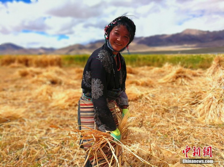 青稞作为青藏高原特有的粮食作物,是西藏种植面积最大、产量占粮食作物比重最高的农作物。2018年,西藏青稞的总种植面积将增至211万亩,产量将突破80万吨。图为9月12日,西藏自治区日喀则市定日县扎果乡的农民次仁曲珍在地里收青稞。 中新社 赵延 摄