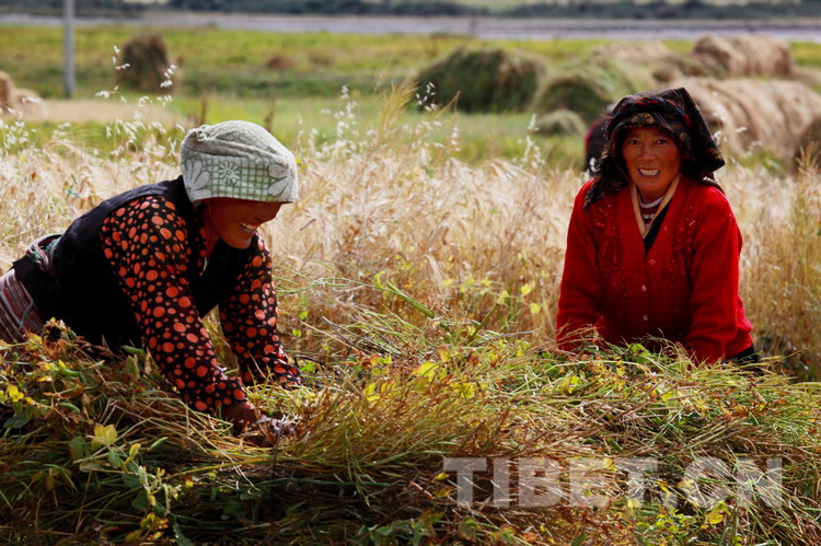 在拉萨市堆龙德庆区古荣乡加入村的青稞地里,金色的穗头深深地弯下了腰,微风吹拂下,黄灿灿的麦浪翻滚,一片喜人的丰收景象。图为农民开始收割前的准备。图片来源:拉萨晚报