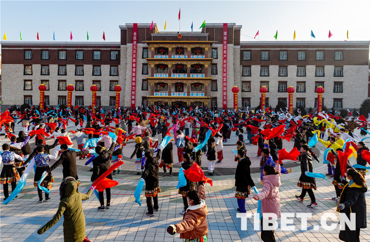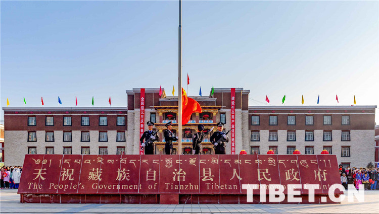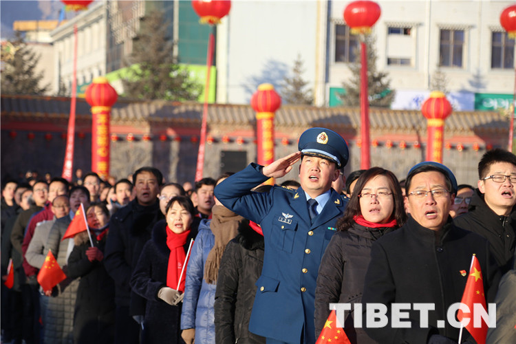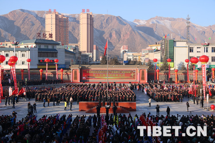 中国西藏网讯 冬日的阳光洒满藏乡天祝,温暖着这片土地。2019年1月1日清晨,在甘肃省武威市天祝藏族自治县政府广场上,人头攒动、热闹非凡,充满着欢快热烈的节日气氛。该县“幸福藏乡•感恩祖国”万人升国旗唱国歌仪式活动暨“欢乐藏乡•和谐天祝”万人锅庄舞表演活动在此拉开帷幕,参与活动的万余名干部群众以升国旗、唱国歌、跳锅庄的方式迎接新年的到来。