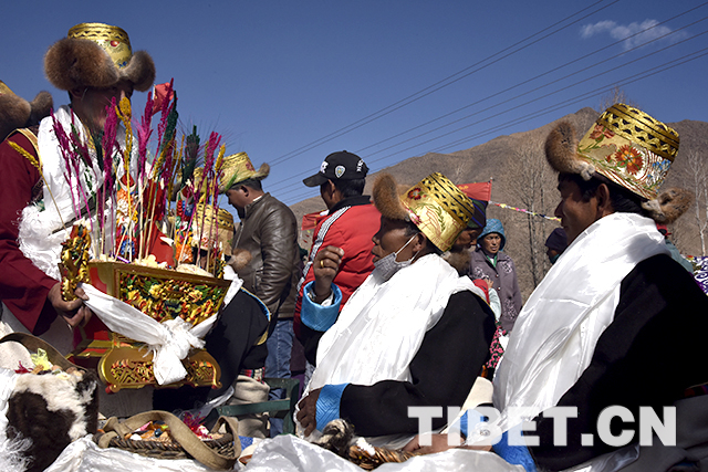 早上9时30分许,农田里白色的桑烟升腾。两位僧人为村里的开耕春播念经祈福;十位能歌善舞的妇女站成一排,吟唱着吉祥的歌曲;村民们则为唱歌的妇女和即将耕种的男女敬献哈达、切玛、青稞酒。这是祈愿新的一年风调雨顺、五谷丰登。