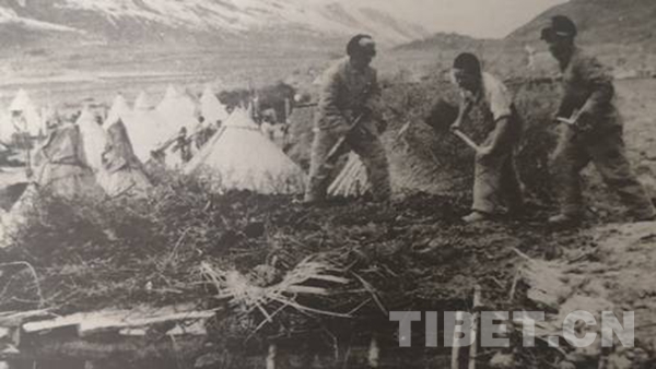 图为1951年4月,修建简易机场时,战士们在搭建住宿帐篷和简易房。图片翻拍自《雪域长歌》