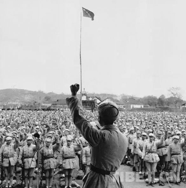 图为十八军在乐山举行进军西藏誓师大会。1950年3月 蓝志贵 摄