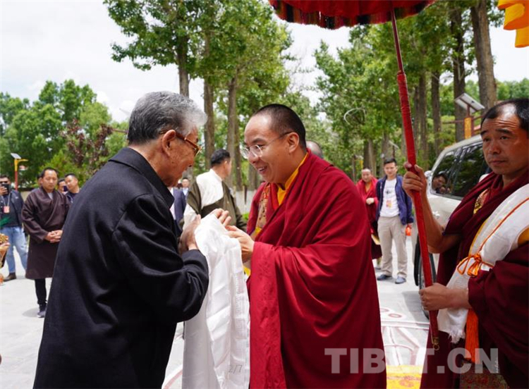 图为西藏自治区党委常务副书记、区政协党组书记丁业现(右)向十一世班禅敬献哈达。摄影:王淑