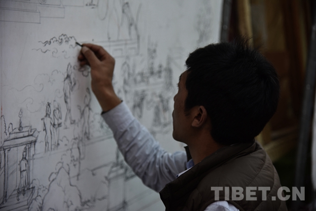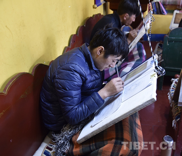 图为赤增绕旦在绘制唐卡底稿 摄影:王媛媛