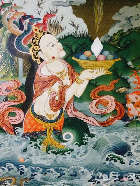 图为赤增绕旦作品《龙界》局部。蛇身龙女从海中出现,向左上方的龙树菩萨(局部画面未体现)敬献象征着声音的海螺,传递人类希望保护自然、与自然和谐相处的声音