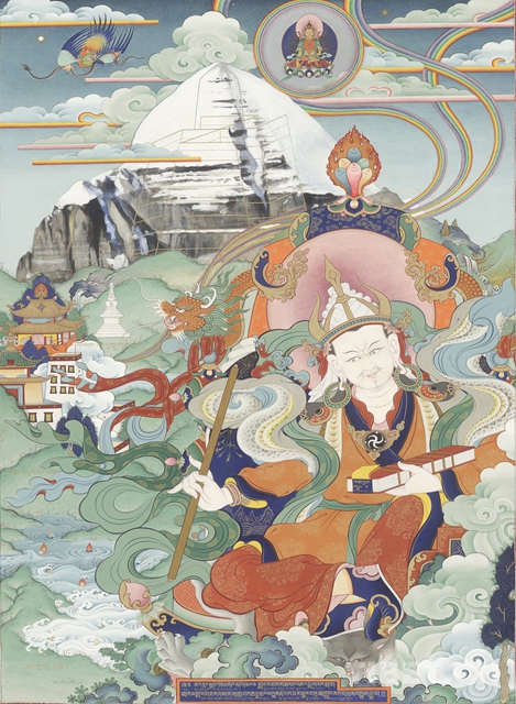 图为赤增绕旦作品《第一代象雄王》,作品表现的内容、地域环境及山石云彩的勾画风格都极赋象雄绘画的特点。2015年该作品被台北故宫博物院馆藏
