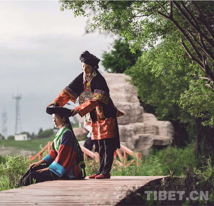 甘南州各县市的中心城镇,作为经济、文化交流中心,人们的服装无论用料、款式、色调等都与农牧区有一定差别。城镇居民一般喜欢以哔叽、毛呢或混纺为衣料,妇女尤讲究款式新颖合身。穿藏袍,里面都要穿衬衣,男式衬衣多半是高领,有大襟和对襟两种,用白色绸布作面料的居多;女式翻领用各种颜色的绸布做成。女式衬衣袖子较长,平时卷起,跳舞时放下,袖随舞起,翩若惊鸿。(中国西藏网 记者/李元梅 图片由甘南藏族自治州文化广电和旅游局提供)