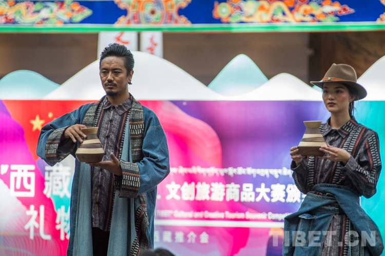 舞台上,藏族模特们手持入围决赛的作品陆续亮相,主持人对作品进行详细地讲解推介,舞台下,来自北京、西藏的文化、艺术、旅游、媒体等不同领域的7位资深评委逐一对商品进行打分。经过激烈角逐,西藏觉醒文化传播有限公司的祈福珠宝系列——祥瑞获得了本次大赛的一等奖;西藏强布斯文化创意有限公司的强布斯藏元素——笔筒等2家企业获得了本次大赛的二等奖;西藏第三极概念文创开发有限公司的第三极•阿里星空灯等3家企业获得了本次大赛的三等奖。