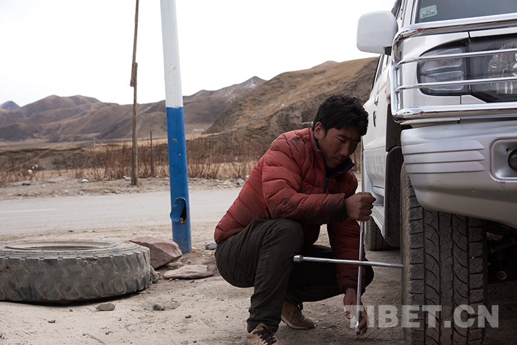 图为嘎玛在更换汽车轮胎 摄影:王媛媛