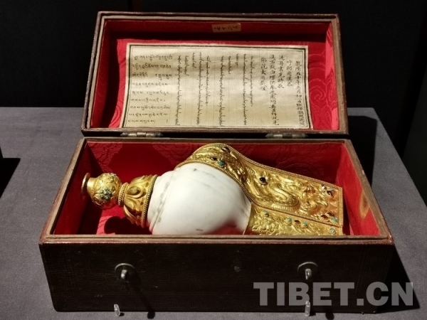 图为右旋白螺,乾隆五十年(1785),故宫博物院藏。此右旋白螺为乾隆五十年七世班禅进献。乾隆四十五年(1780)六世班禅在北京西黄寺圆寂后,扎什伦布寺于次年访得候选灵童四人。经过索本堪布扎萨克喇嘛及八世达赖喇嘛鉴别,确认于后藏吉雄地方的一名孩童为六世班禅转世灵童,遂向乾隆帝上表奏明。十二月二十日,乾隆帝颁布敕谕以表承认。乾隆四十九年(1784),七世班禅完成坐床及受近世戒仪式。次年正月乾隆帝遣驻藏大臣颁给班禅敕书、哈达等。班禅呈进内库长哈达等,上表谢恩。图片拍摄自“须弥福寿——当扎什伦布寺遇上紫禁城”展(图片注释参考自展览)摄影:孔夏