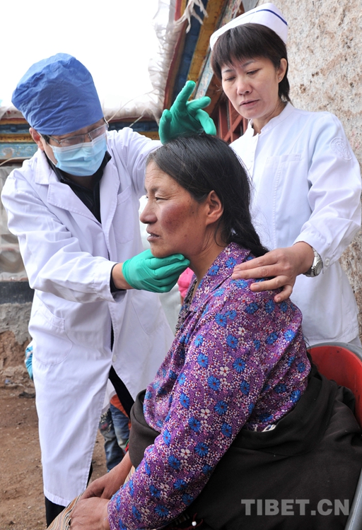 这是曾为斯求卓玛进行手术的北京口腔医院头颈肿瘤科主任韩正学(左)到藏北上门为斯求卓玛做术后检查。(唐召明2015年7月14日摄)
